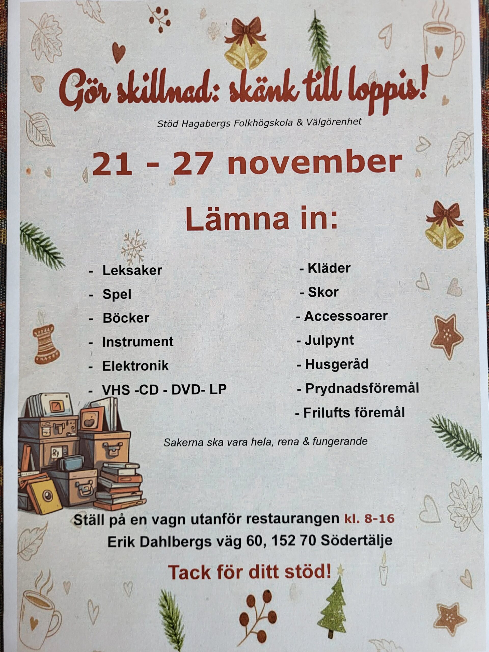21-27 november kan du skänka till vår loppis. Lämna in leksaker, spel, böcker, husgeråd etc. Ställ på vagn utanför restaurangen kl. 8-16.